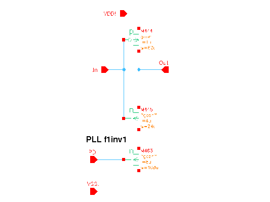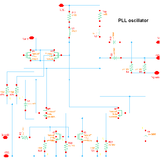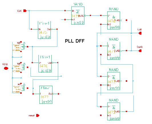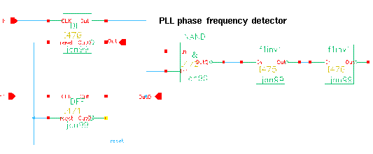 Der PFD ist mit flankengetriggerten DFF aufgebaut, vgl. B. Razavi, RF Microelectronics" . Die Ladungspumpe ist bei allen Filtervarianten gleich und besteht jeweils aus zwei einfachen Schalttransistoren. Das Schleifenfilter ist variiert :