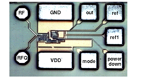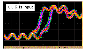 Dual Modulus Prescaler operate @ 3.8GHz / 10.75mW total power. The input signal feed through to the output signal. One of the internal low speed flip-flop do not work, since this design has been optimized for 350 nm technology. So the division ratio is 64/65 here instead of 128/129. The high speed block has no timing problems due to the faster transistors in this technology.