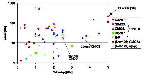 The best value in literature reference for CMOS is 24 mW@3V and 1.8 GHz [48].