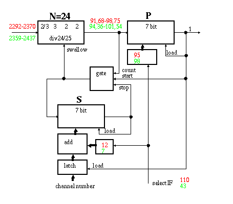 Der prescaler ist in der Version fuer c7na vom August 1998 verwendet und nicht weiter veraendert worden. Zusätzlich ist noch ein Sourcefolger integriert worden, um die Schleifenfilter DC als niederohmigen Monitorausgang bereitzustellen. Ausserdem sind drei Monitorausgänge fuer die digitalen low-speed Signale vorhanden.