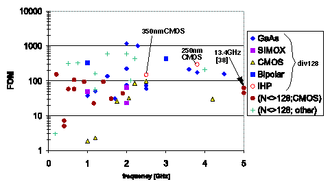 The best value in literature reference for CMOS is 24 mW@3V and 1.8 GHz [48].